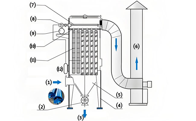 Принять технологию импульсной струйной очистки от пыли, обеспечивающую высокую эффективность удаления пыли, эффективно продлевая цикл очистки, в свою очередь, снижается степень усталости фильтровальных мешков и импульсных клапанов, а срок службы фильтровальных мешков и клапанов увеличивается.