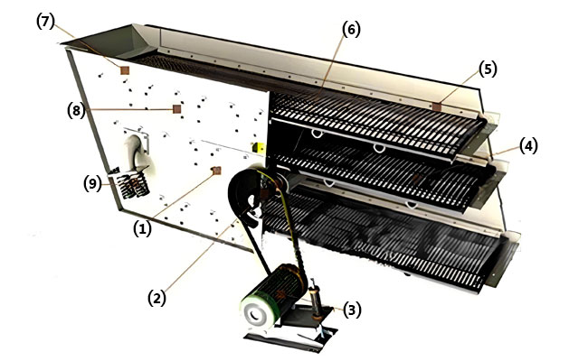Конструкция вибросита сложная и обычно состоит из ситового короба, вибратора, демпфирующего пружинного устройства, сита, ситового зажима, шасси и т. д. Кроме того, конструкция вибросита будет различной в зависимости от типа вибросита. экран. Например, вибросито круглого сечения также включает в себя цилиндрический эксцентриковый вибровозбудитель, демпфирующее пружинное устройство, шасси и другие компоненты. Вибросито линейное состоит из рамы сита, основания двигателя, кронштейна и т. д.; эллиптический вибрационный грохот состоит из передаточного устройства, демпфера, шасси и т.д.