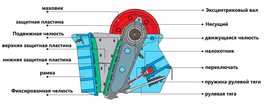Кроме того, когда дробилка останавливается или подвергается воздействию внешней силы, инерционная сила маховика может защитить машину и предотвратить повреждение щековой дробилки из-за чрезмерной силы удара.