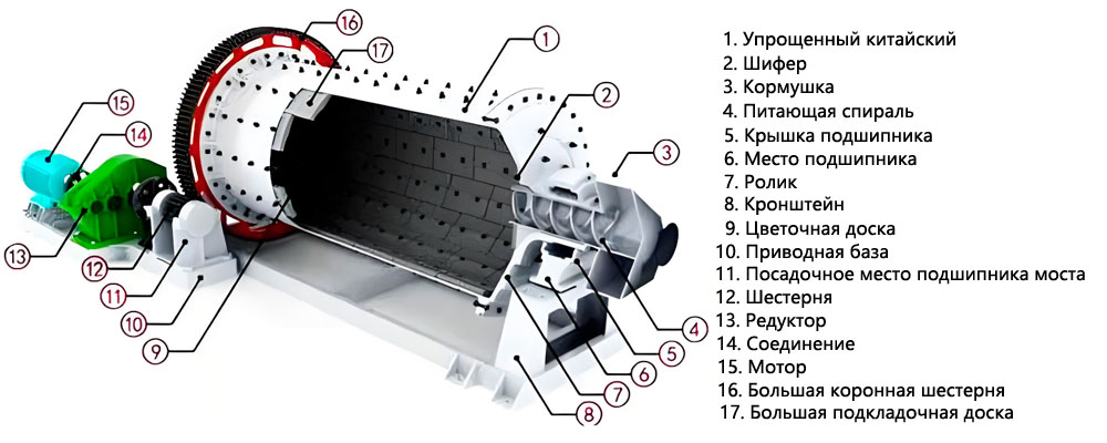 Цилиндр шаровой машины является одной из ее основных рабочих частей. Измельчаемый материал подвергается ударному и измельчающему воздействию шлифовального тела в цилиндре и превращается в мелкий порошок.