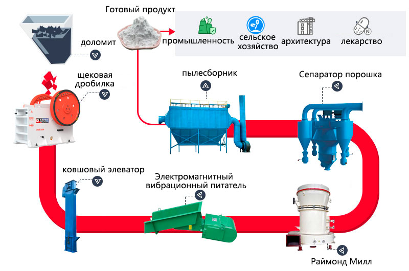 Дробленый доломит дополнительно измельчается с помощью измельчительного оборудования для получения необходимого доломитового порошка. Обычное измельчающее оборудование включает в себя подвесные валковые мельницы высокого давления, мельницы сверхтонкого измельчения и т. д.