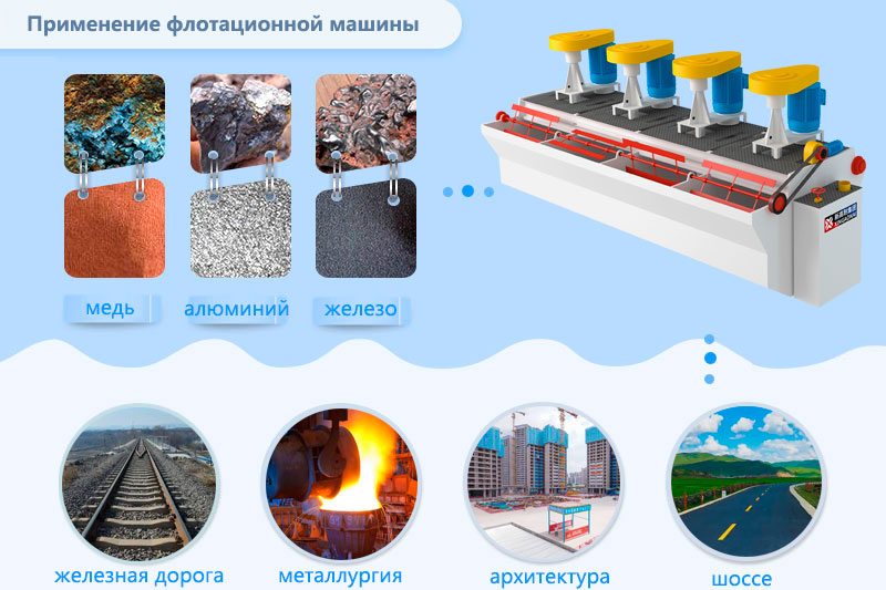 Флотационные машины в основном используются для отделения золота, серебра, меди, железа, свинца, цинка, молибдена, никеля, алюминия и других металлических минералов. Его также можно использовать для сортировки черных металлов и неметаллов. Он обладает преимуществами простой конструкции, удобства эксплуатации и хорошего эффекта переработки полезных ископаемых и широко используется в горнодобывающей и металлургической промышленности.