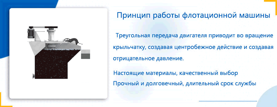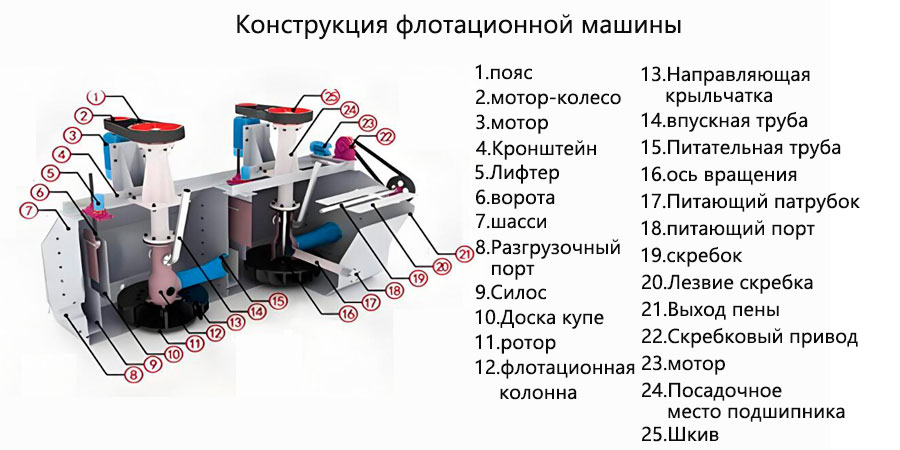 Флотационная машина в основном состоит из флотационной камеры, смесительного устройства, аэрационного устройства, устройства для выпуска минерализованной пены и двигателя.