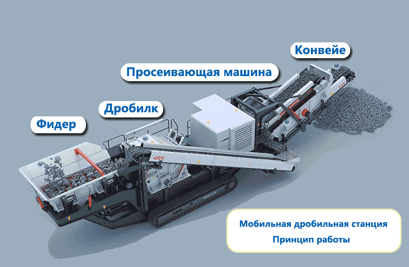 Принцип работы мобильной дробилки заключается в подаче сырья в щековую дробилку через питатель. Щековая дробилка разбивает сырье на частицы необходимого размера, а затем транспортирует измельченные материалы к целевому месту по конвейерной ленте. наконец, через Вибросито просеивает и отделяет материалы с частицами разного размера.