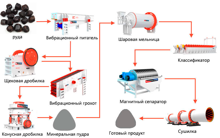 Сортировочное оборудование: гранатовый магнитный сепаратор, питатель, грохот, конвейер.