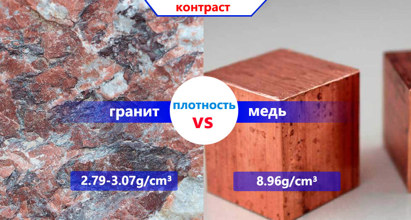 Плотность гранита составляет 2,79-3,07 г/см³, а плотность меди — 8,96 г/см³, поэтому плотность гранита меньше плотности меди, то есть плотность меди больше плотности гранита.