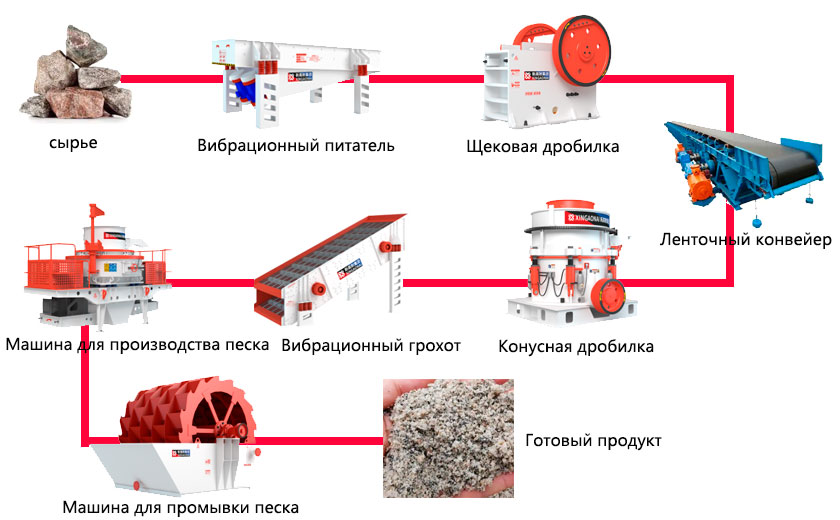 Технологическая схема производственной линии следующая: подача, грубое дробление, среднее и мелкое дробление, производство песка, просеивание и промывка песка. Материал равномерно подается в загрузочное отверстие щековой дробилки через вибрационный питатель для грубого дробления, разбивая крупные куски гранита на мелкие. Измельченные материалы просеиваются на вибросите, крупные куски повторно измельчаются, а готовые материалы по конвейеру отправляются в конусную дробилку для среднего и мелкого дробления. Затем измельченные материалы отправляются в пескоделательную машину для тонкого дробления. Наконец, после просеивания на сортировочном оборудовании материал очищается на пескомойке и получается чистый гранитный песок.