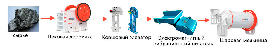В его состав входят щековая дробилка, шаровая мельница, редуктор, анализатор, трубопроводное устройство, воздуходувка, пылеуловитель, ковшовый элеватор, электромагнитный вибрационный питатель, электронная система управления и т. д. Система измельчения отличается высокой производительностью и низким энергопотреблением, высокой тонкостью помола продукта, является чистой, экологически чистой, безопасной и надежной.