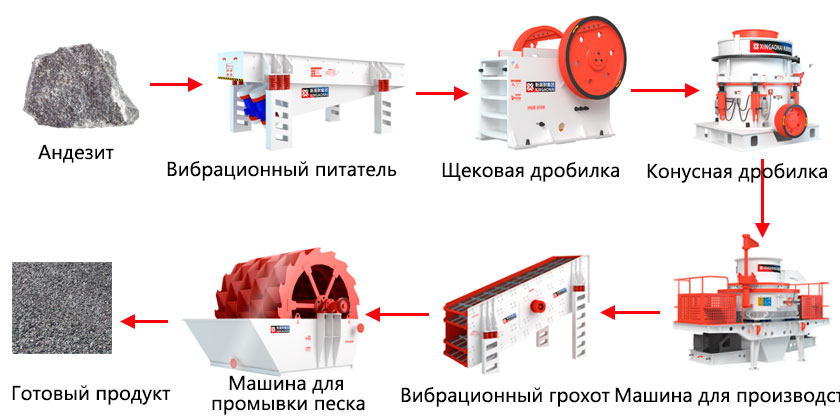 Основной процесс производства андезита делится на три этапа: грубое дробление, среднее и мелкое дробление, а также изготовление и формование песка.