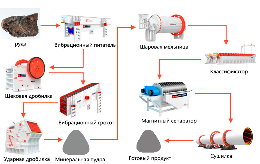 Основное оборудование: вибрационный питатель, щековая дробилка, ударная дробилка, вибросито, шаровая мельница, классификатор, магнитный сепаратор, сушилка и т. д.