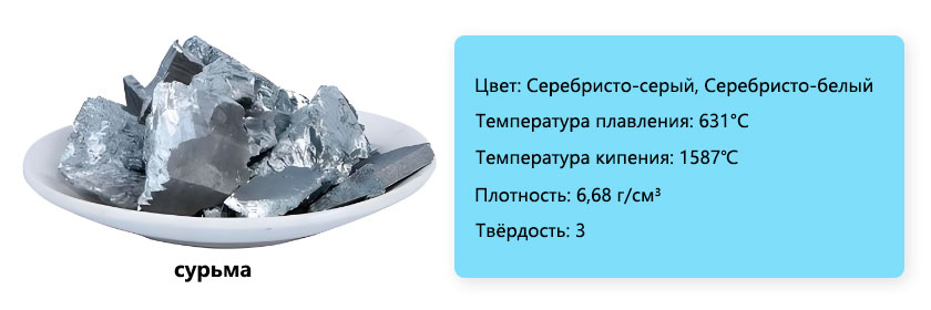 Сурьма — это серый металлический элемент с металлическим блеском. Он существует в твердой форме при комнатной температуре, обычно в виде серебристо-серой или серебристо-белой ромбовидной кристаллической структуры. Сурьма имеет большой удельный вес, но плохую электро- и теплопроводность. Температура плавления, кипения и плотность сурьмы составляют 631℃, 1587℃ и 6,68 г/см³ соответственно. Это относительно мягкий металл с твердостью около 3. Сурьма также обладает уникальными характеристиками теплового сжатия, холодного расширения и уменьшения сопротивления с повышением температуры.