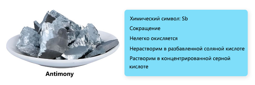 Химический символ сурьмы — Sb. Сама по себе она не обладает восстановительными свойствами, но соединения сурьмы обладают восстановительными свойствами, занимая промежуточное положение между металлами и неметаллами.