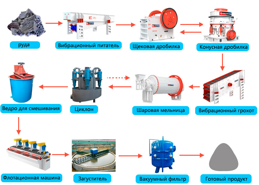 Основным процессом переработки полезных ископаемых является этап флотации, на котором в основном используется флотационная машина для грубой селекции, а затем добавляются реагенты для четырех тонких селекции с целью выделения сурьмяного концентрата. Этот процесс является ключевым этапом и основным процессом в производственной линии обогащения сурьмяной руды. Наконец, концентрат необходимо обезвожить во второй раз, что обычно выполняется концентратором. Пена флотируемого сурьмяного концентрата подается в концентратор шламовым насосом для первичного обезвоживания, а затем поступает в фильтр для вторичного обезвоживания. Наконец, сурьмяный концентрат обезвоживается и отбирается. Что касается переработки хвостов, пользователи могут перерабатывать их.