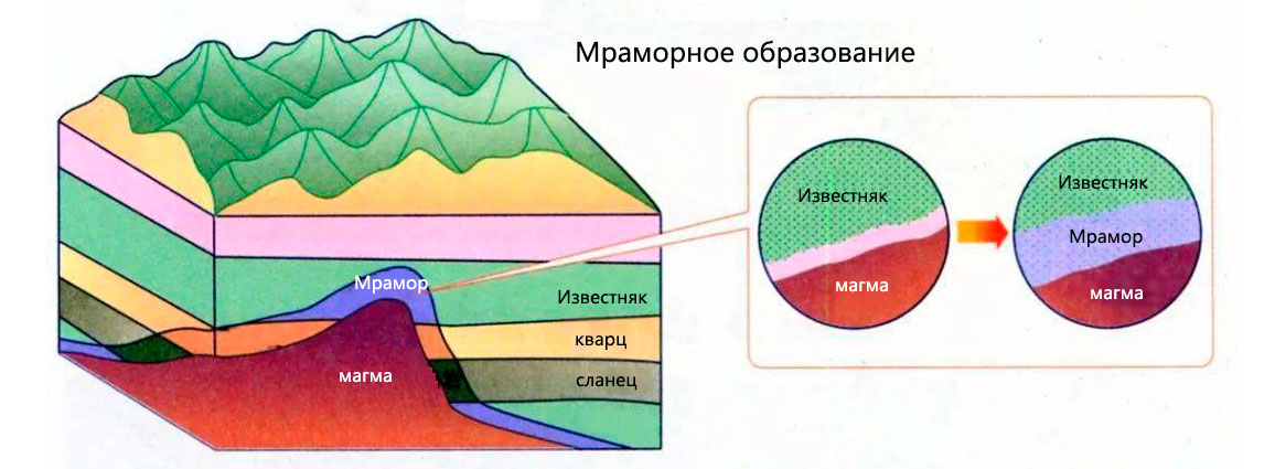 Мрамор — это природная метаморфическая порода, состоящая из пористой карбонатной породы или известняка, подвергающаяся воздействию высокой температуры и высокого давления. Она подвергается интенсивным процессам кристаллизации, таким как сжатие, сморщивание, скручивание, трещины и складчатость под землей. Минеральный состав и организационная структура породы постоянно меняются. После длительной геологической эволюции образуется мрамор — прекрасный природный камень.