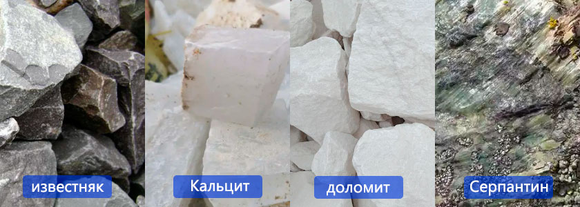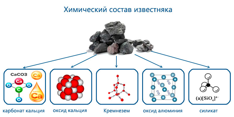 Известняк в основном состоит из кальцита. После обжига он может стать негашеной известью, основным компонентом которой является карбонат кальция, содержание которого составляет более 90%. Химический состав негашеной извести — оксид кальция. Она выглядит как блок, имеет светло-серый или светло-желтый цвет и обычно содержит некоторые примеси. Гашеная известь, также известная как гашеная известь, — еще один тип известняка. Она образуется путем увлажнения негашеной извести или путем добавления воды. Кроме того, известняк содержит такие компоненты, как диоксид кремния, оксид кальция, силикаты, оксид марганца и оксид железа.