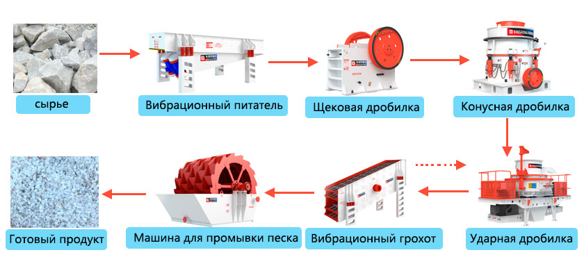 Мраморный материал равномерно транспортируется в щековая дробилка с помощью вибрационного питателя для первичного дробления. Затем измельченные материалы измельчаются в конусной дробилке для среднего и мелкого дробления, чтобы получить размер частиц, необходимый для машины по производству песка. Затем материал измельчается и формуется пескоделательной машиной и просеивается виброситом. Неквалифицированный материал возвращается в пескоделательную машину, а квалифицированный материал отправляется в пескомоечную машину для очистки от примесей. Наконец, готовый продукт отправляется в зону хранения материалов.