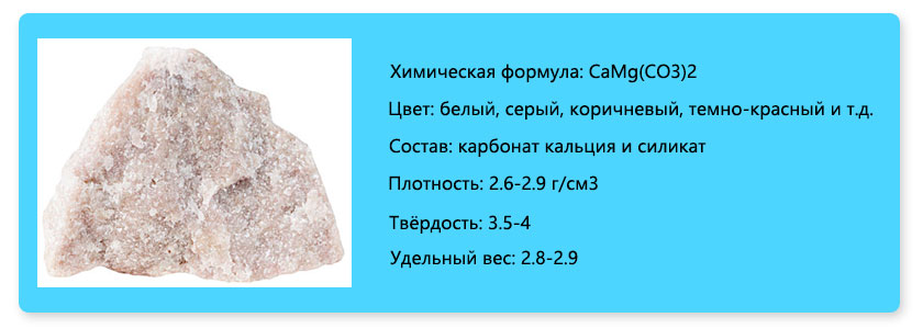 Доломит (CaMg(CO3)2) — метаморфическая горная порода, состоящая в основном из карбоната кальция и силиката. Содержит больше примесей, таких как марганец, железо, кварц и т. д. Его текстура относительно мягкая и хрупкая, имеет много пор и трещин.