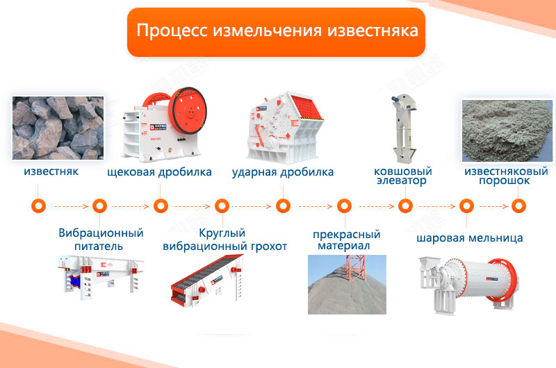 Необходимое оборудование: щековая дробилка, ударная дробилка, конвейер, вибрационный питатель, грохот, известнякоизмельчительная машина и т. д.