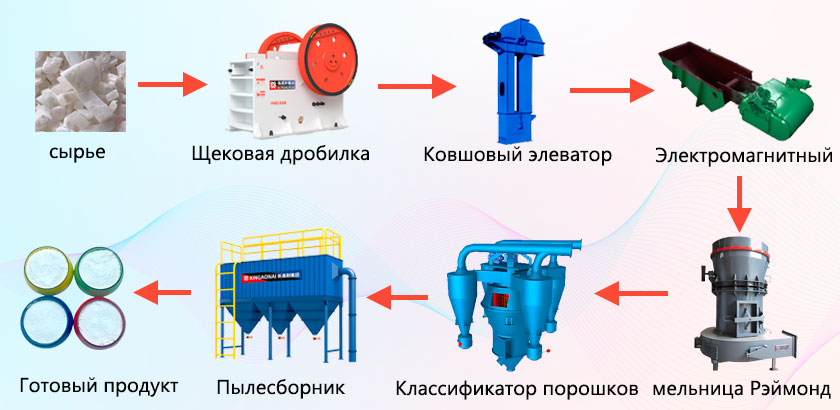 Процесс измельчения происходит следующим образом: крупные куски пегматит загружаются в щековую дробилку для дробления и переработки. После дробления готовая продукция, соответствующая требованиям по размеру частиц, через ковшовый элеватор отправляется в силос. Затем электромагнитный вибрационный питатель отправляет пегматит, отвечающий требованиям, на мельницу Raymond для измельчения. Отобранный пегматит отправляется в штабель готовой продукции, а неотобранный пегматит возвращается на мельницу Raymond для повторного измельчения до тех пор, пока все пегматиты не будут соответствовать строительным требованиям.