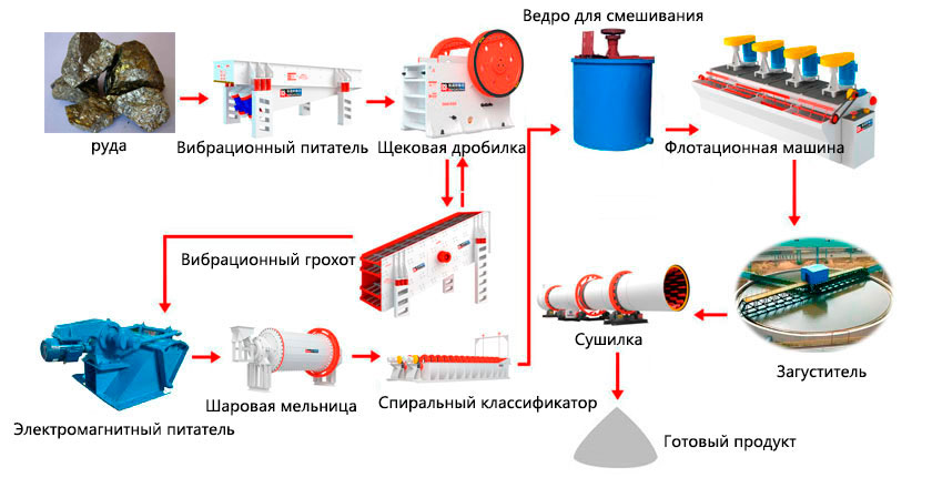 Обезвоживание: Полученный после флотации концентрат отправляется в концентратор для осаждения, затем в фильтр для обезвоживания и, наконец, в сушилку для сушки с получением концентрата.