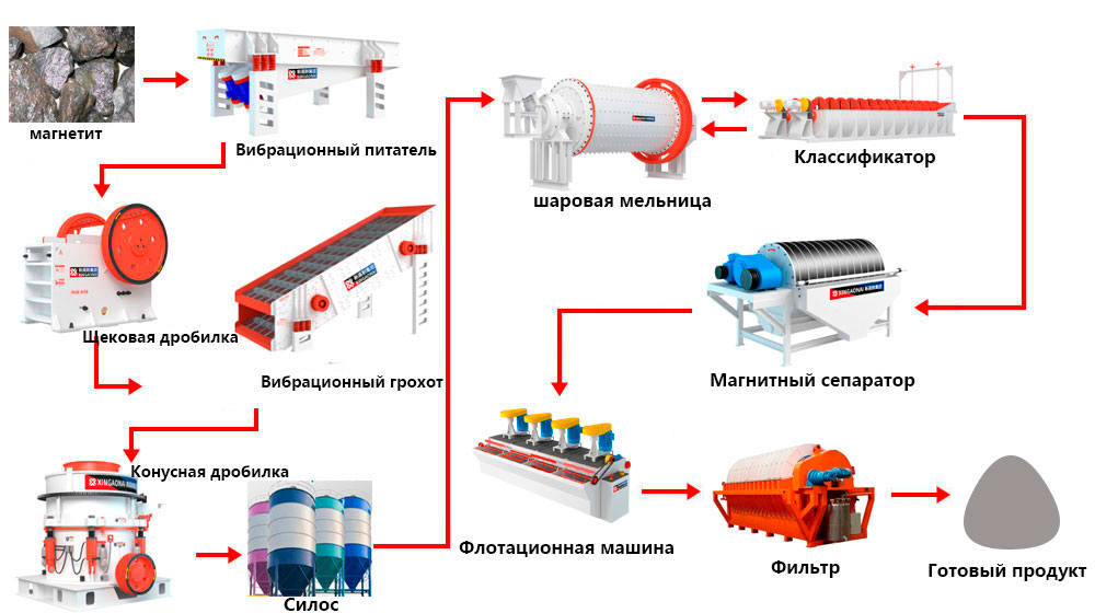 В зависимости от магнитной силы руды выбирается способ обогащения руды, адаптирующийся к ее свойствам. Процесс магнитной сепарации используется в качестве основного технологического метода, а сочетание гравитационного разделения, флотации, магнитной сепарации обжига и т. д. представляет собой комбинированный технологический метод. Выбор и разделение руды имеет основу.